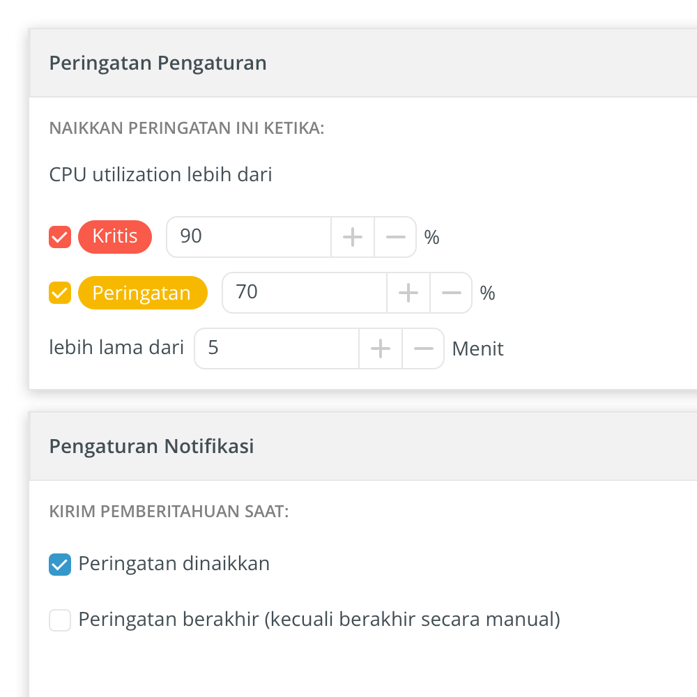 Menetapkan ambang pemberitahuan kustom untuk memantau infrastruktur Anda. Menerima pemberitahuan saat aturan ambang batas yang Anda tentukan tercapai. Misalnya: ketika pemanfaatan CPU melebihi 90% selama lebih dari 30 menit.