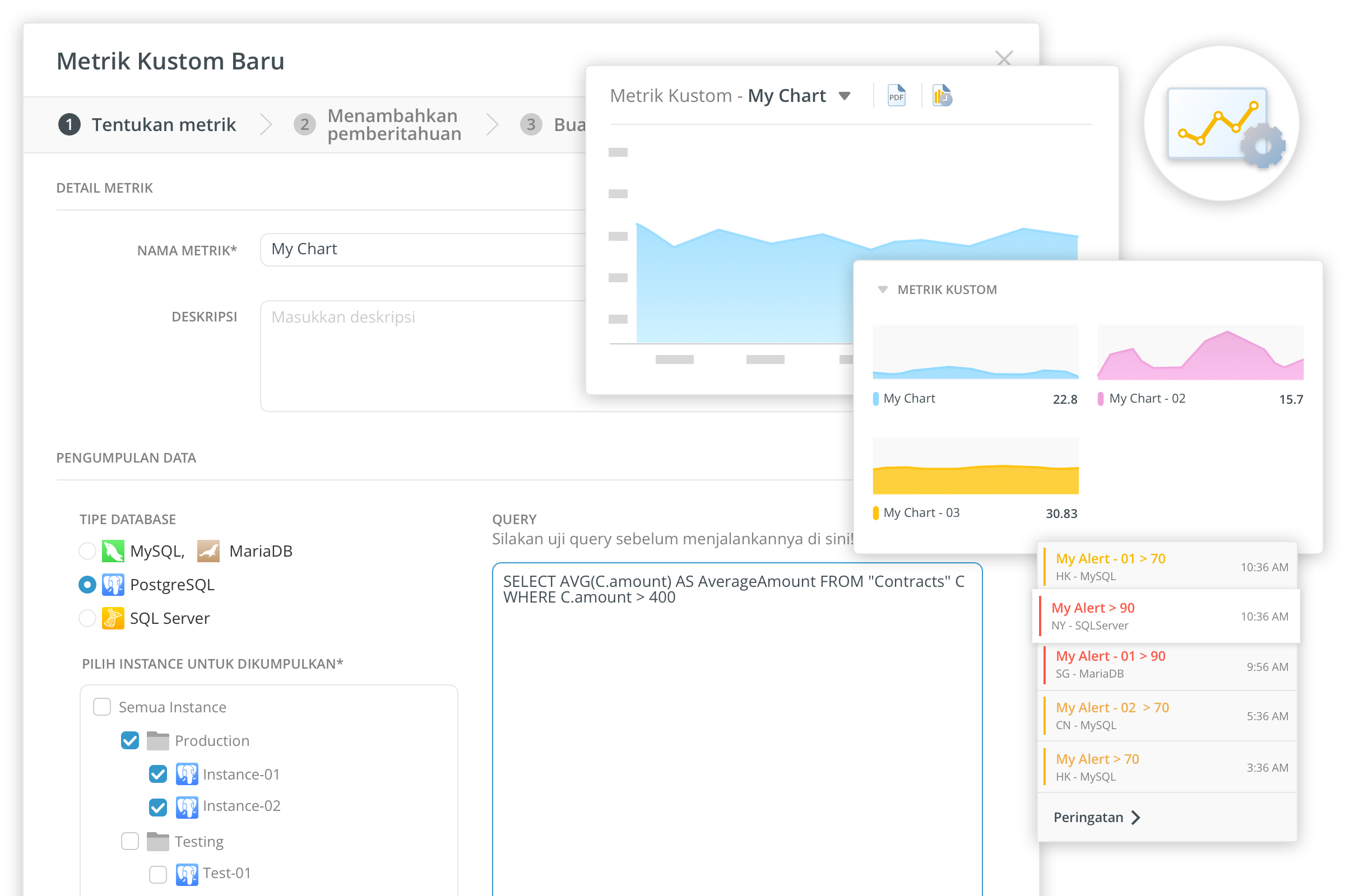 Menuliskan query Anda sendiri untuk membuat chart kustom untuk mengambil data metrik arbitrer. Anda dapat dengan mudah menentukan metrik kustom Anda dan mengatur peringatan untuk menganalisis dan memantau server Anda.
