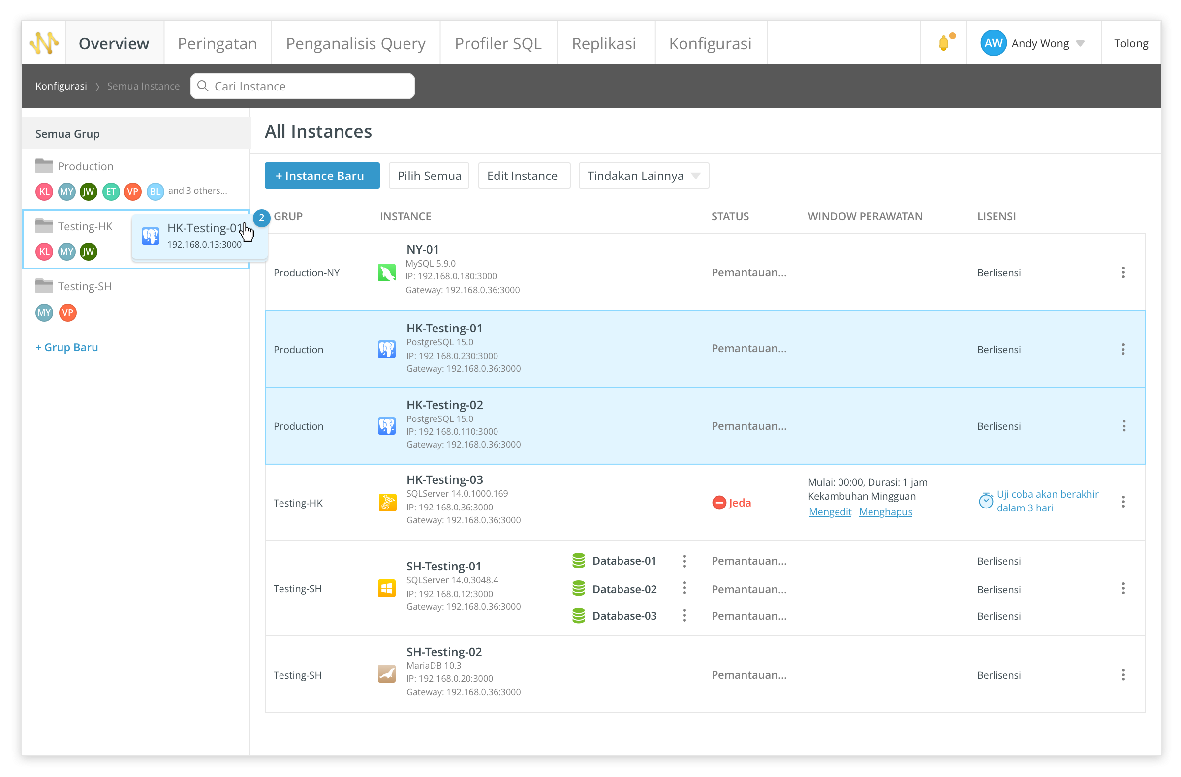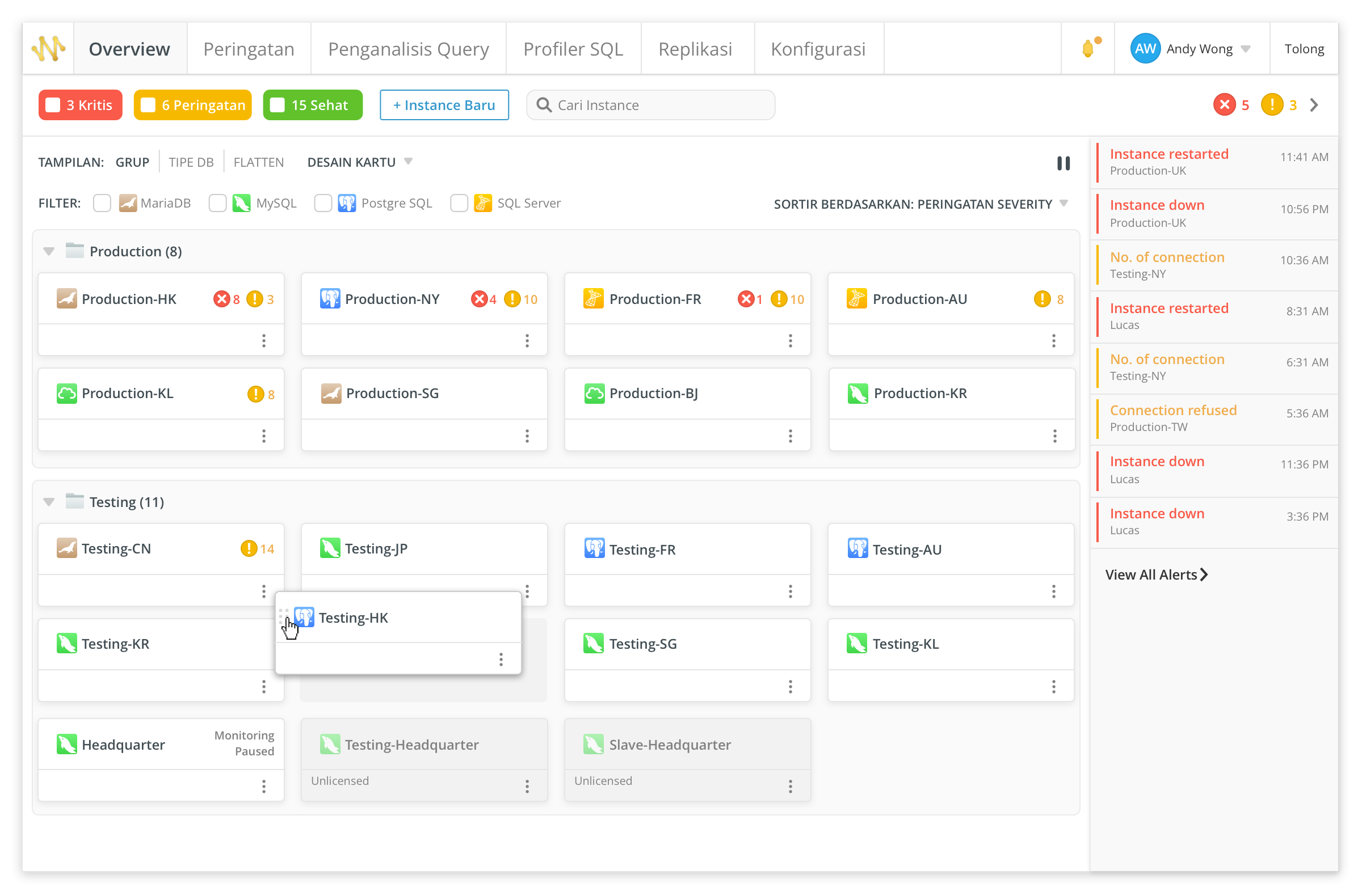 Dasbor interaktif kami mencantumkan semua instance yang dipantau dan memungkinkan Anda untuk dengan mudah melihat bagaimana instance Anda saat ini berfungsi. Ini juga memberi Anda gambaran umum tentang kinerja, ketersediaan, dan kesehatan setiap instance.
