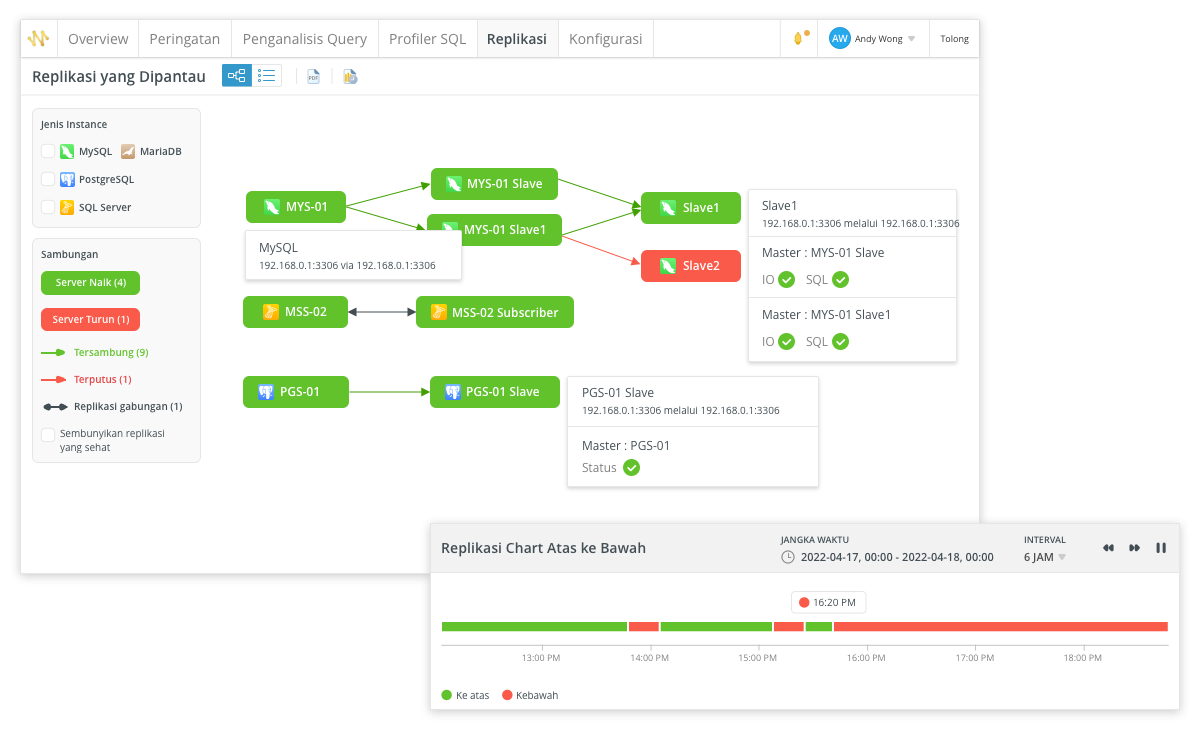 Menerapkan chart skematik untuk mewakili hubungan replikasi secara visual. Anda dapat memantau kesehatan keseluruhan topologi replikasi secara keseluruhan, setiap node individu, dan setiap subsistem replikasi untuk memastikan data pada server yang direplikasi selalu diperbarui.
