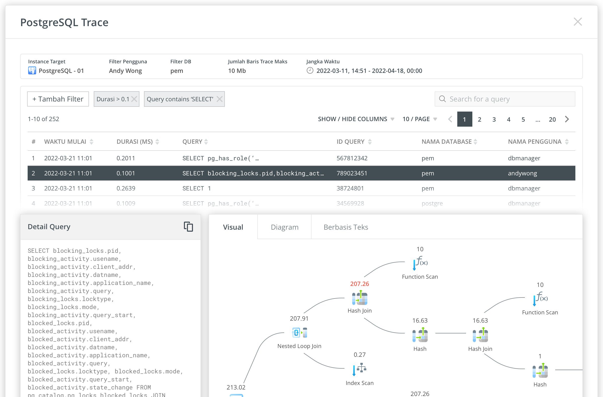 Menyediakan detail eksekusi query grafis untuk menemukan query yang tidak efisien dan lambat. Anda dapat membuat jejak untuk mengumpulkan data tentang query yang dijalankan pada instance. Data nantinya dapat dianalisis dan digunakan untuk memecahkan masalah performa.