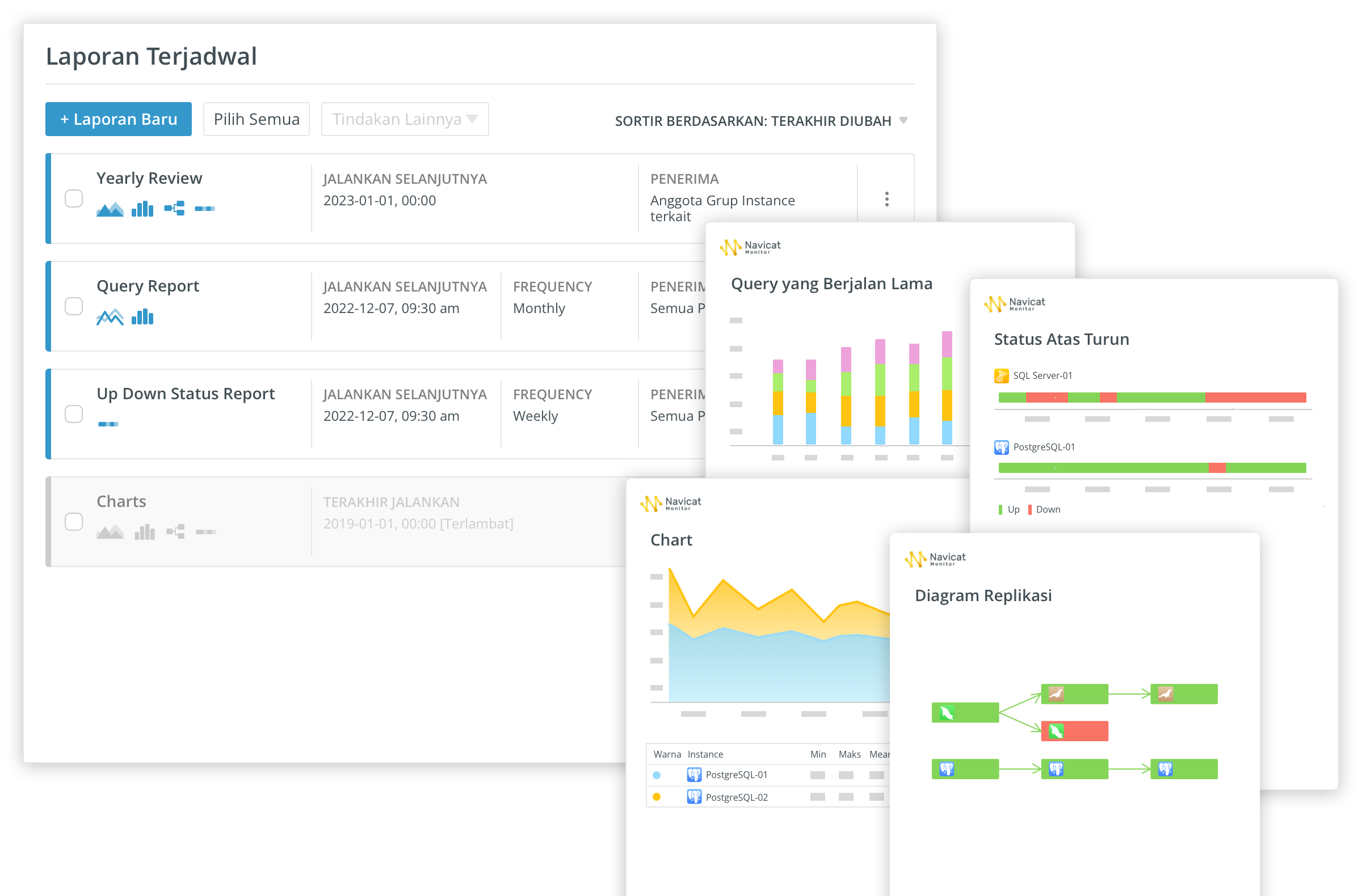 Navicat Monitor adalah alat pemantauan server jarak jauh yang aman, sederhana, dan tanpa agen yang dikemas dengan fitur-fitur canggih untuk membuat pemantauan Anda seefektif mungkin. Server yang dipantau termasuk MySQL, MariaDB, PostgreSQL dan SQL Server, dan kompatibel dengan database cloud seperti Amazon RDS, Amazon Aurora, Oracle Cloud, Google Cloud dan Microsoft Azure.