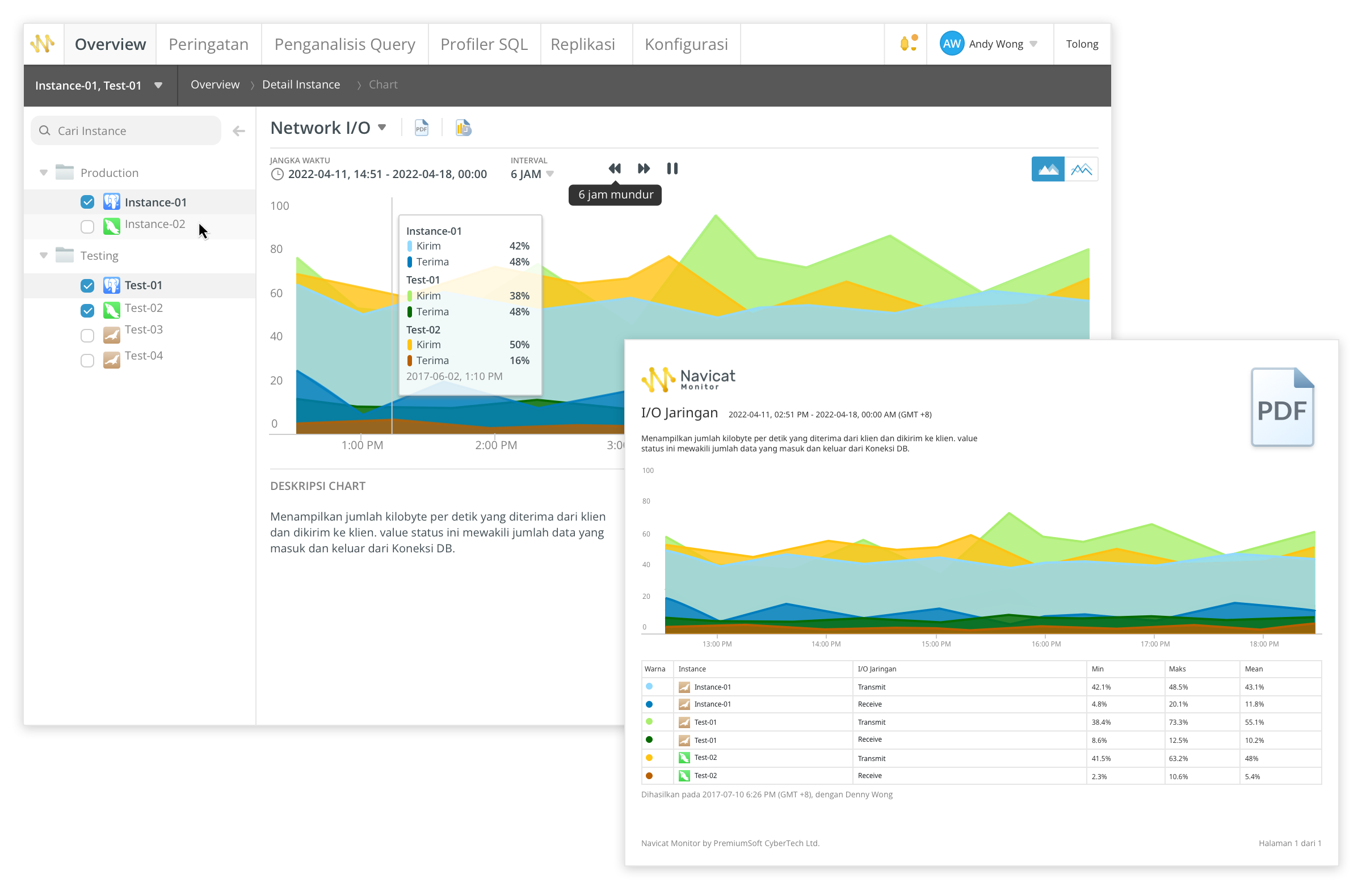 Mengumpulkan metrik beberapa instance pada diagram yang sama untuk membandingkan dan menganalisis data dengan kecepatan luar biasa. Anda juga dapat menyimpan chart Anda sebagai dokumen PDF berkualitas tinggi dengan satu klik.